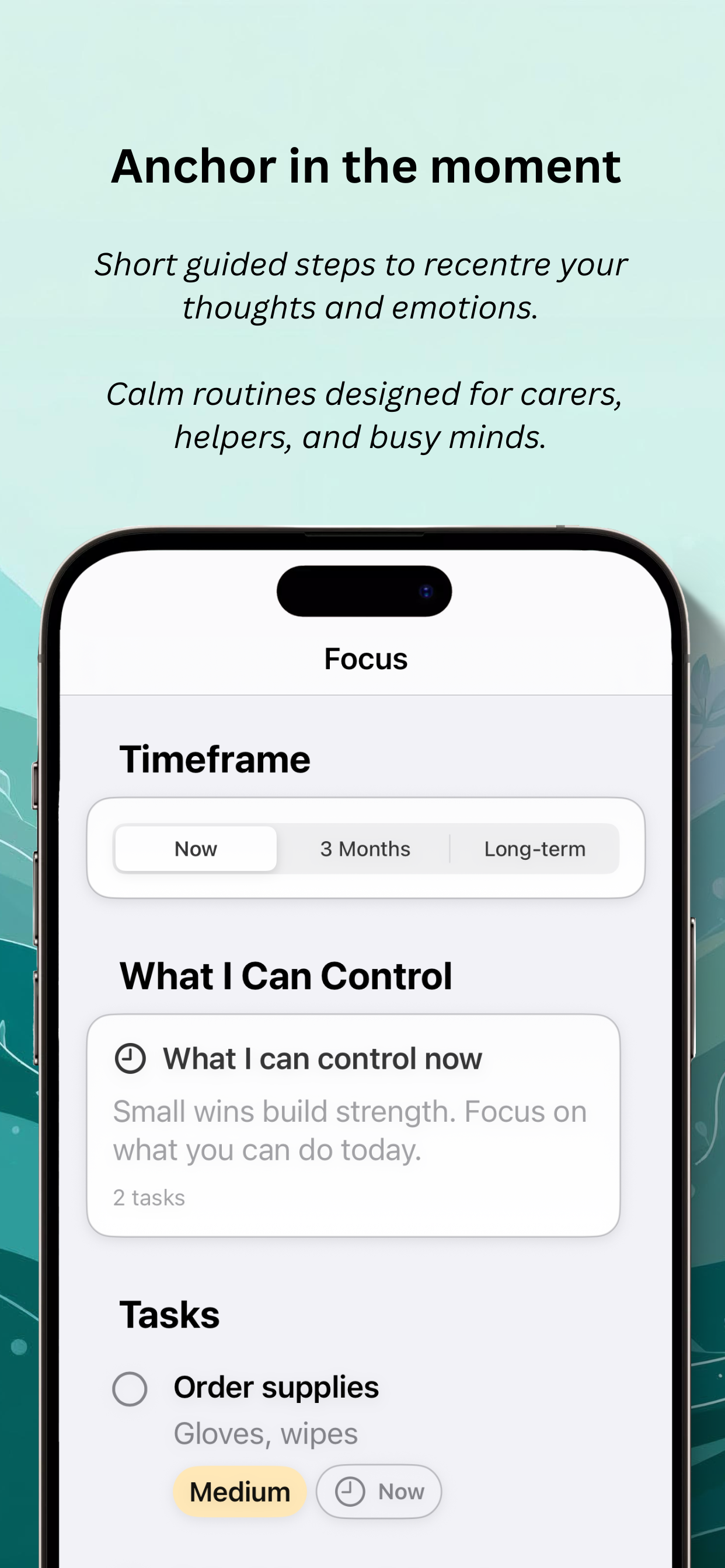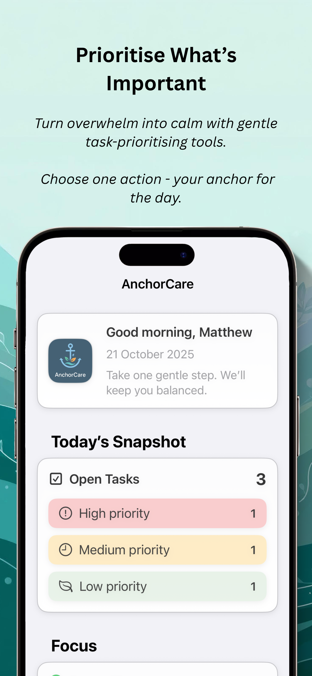 Anchare helps you prioritise what matters most — when life feels overwhelming. Designed for family carers and caregivers, helpers, and anyone juggling too much, this simple app helps you slow down, breathe, and bring clarity back to your day.